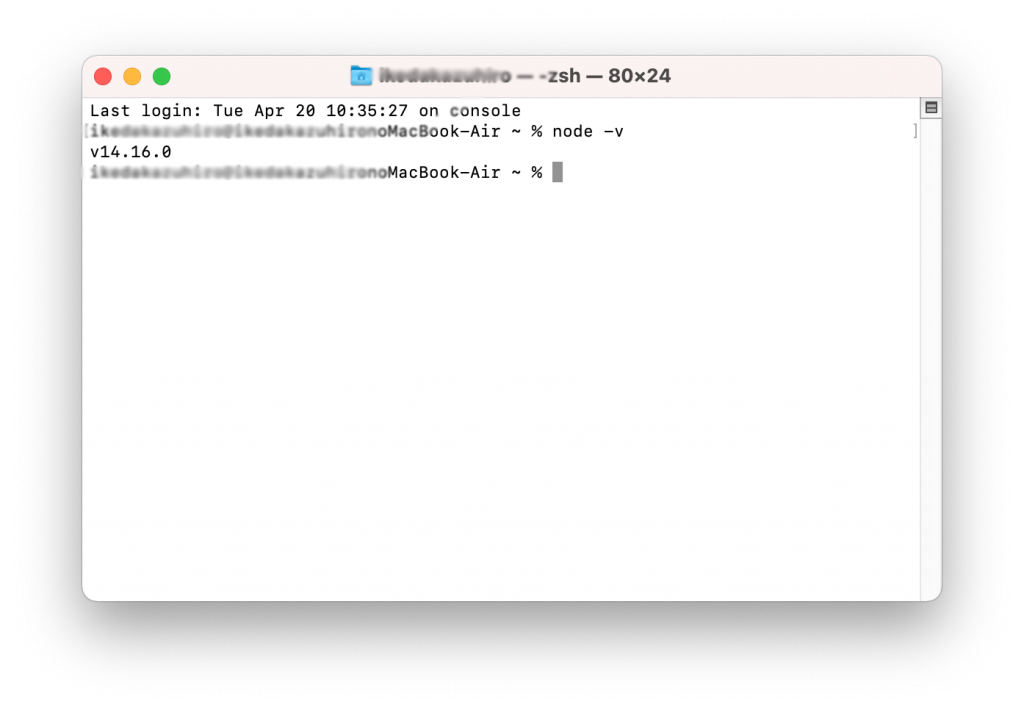 nodeもターミナルなどシェルで使いますので、「ターミナル」を開いて以下のコマンドを打ちます。