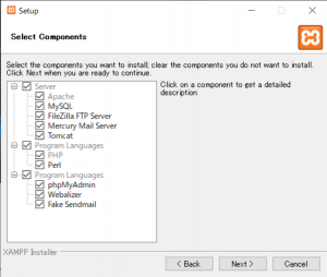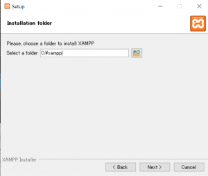 インストール先を聞いてきますのでデフォルトのまま「C:¥xampp」にします。
