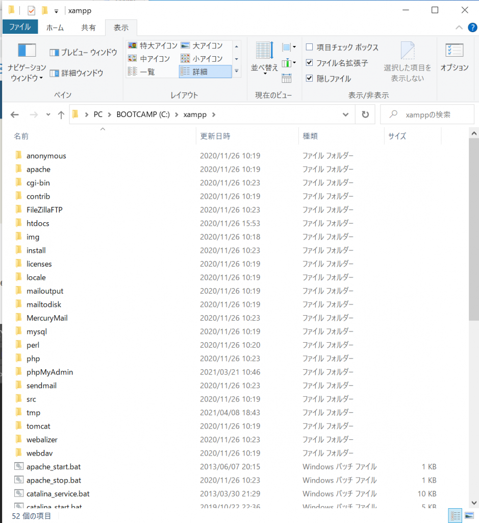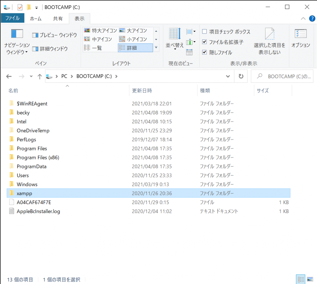 インストールが終わると、ちゃんとC:¥xamppがあるか確認してみましょう。