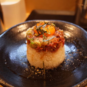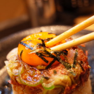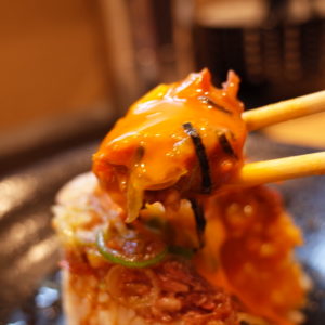 卵黄を崩して肉とご飯に絡めていただきます。