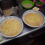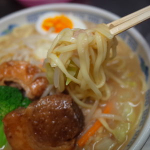 醤油だれを入れて、スープを注ぎ。麺はちょっとカタ麺に茹でました。