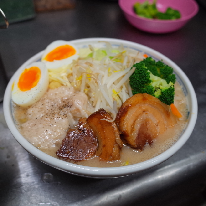賄い紹介【濃厚豚骨にせ二郎~ブロッコリーと半熟卵をのせて】