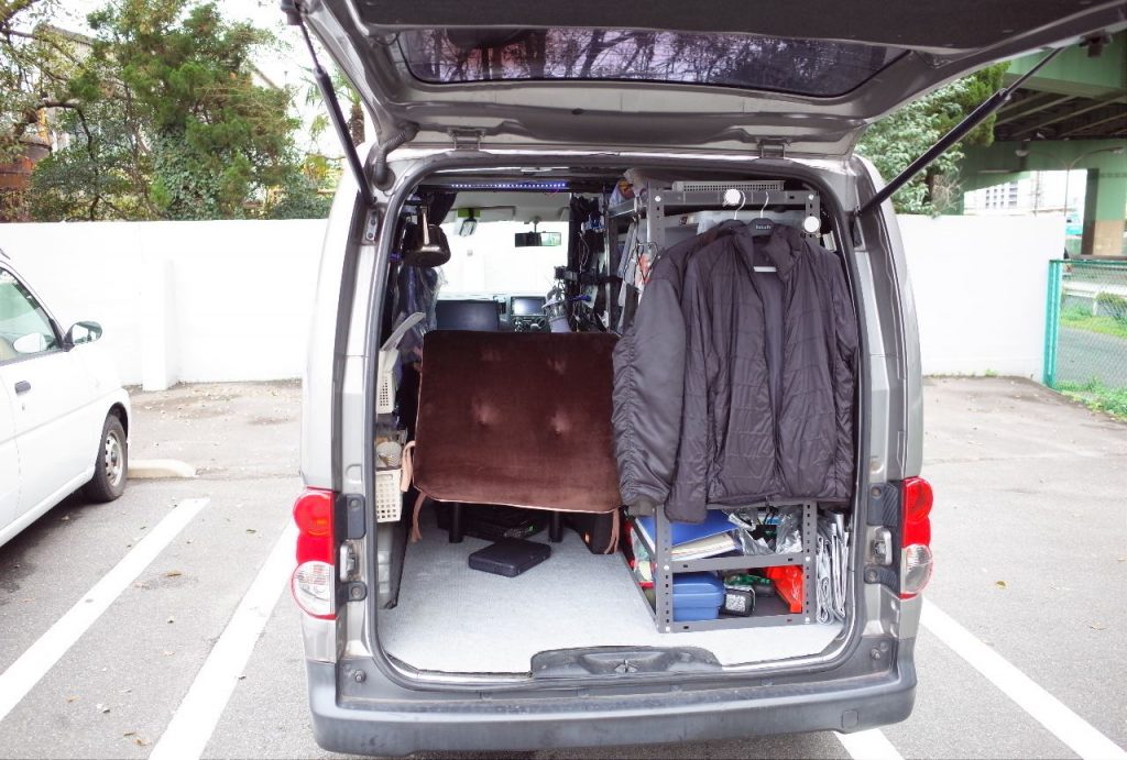 いよいよ車内にラックをマウントして、生活用品をすべて積み込んでみた。