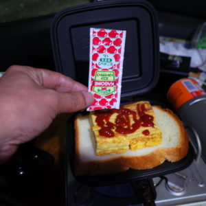 厚焼き玉子は切れてるのでそのままのせます。ケチャップも少々。